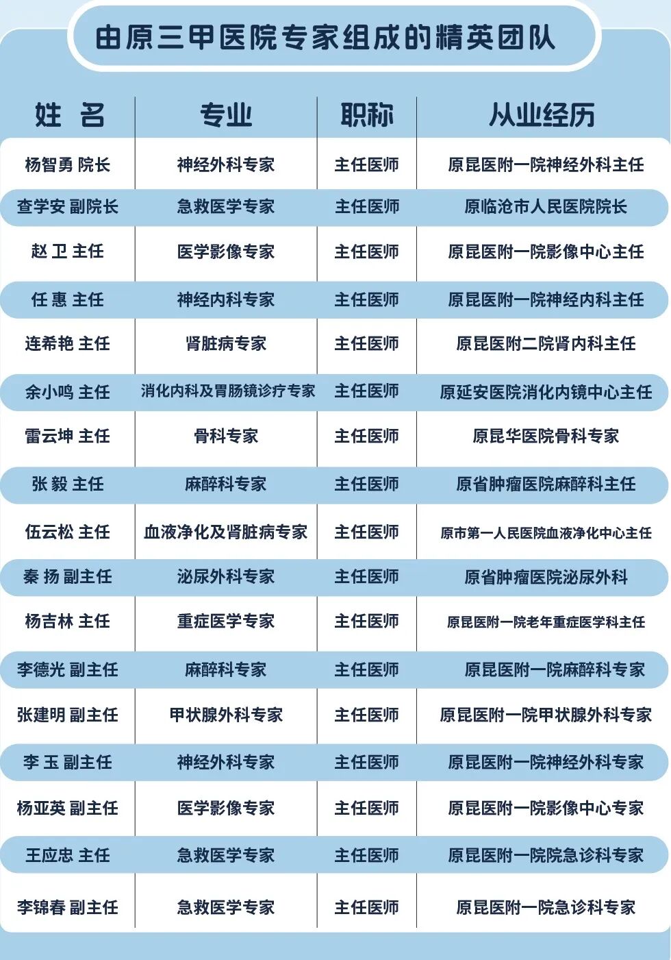 核心团队均由原云大医院、昆医附二院、市一院、市延安医院等三甲医院核心科室主任医师级专家组成,
